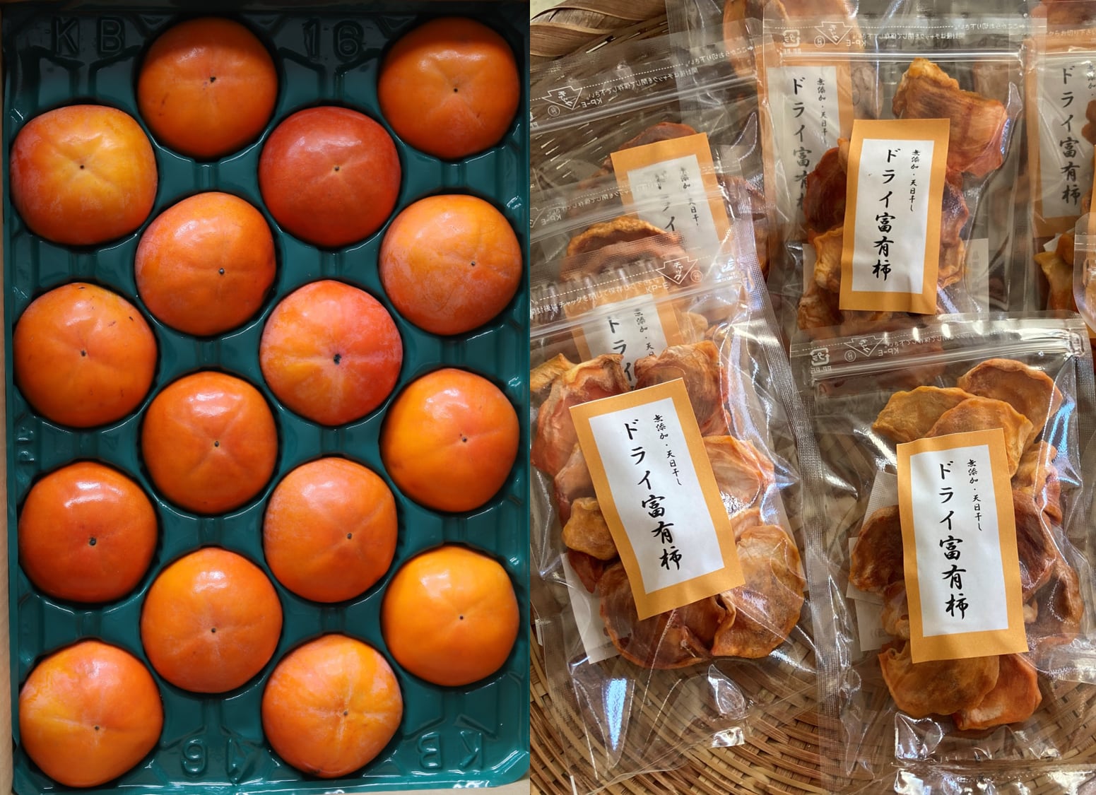 当園自慢の富有柿の中でも中玉サイズと富有柿を一つひとつ丁寧に、種を取り除き、スライスし天日干しで乾燥させた「しっとり濃厚な」ドライ柿を2P詰合せたセット。